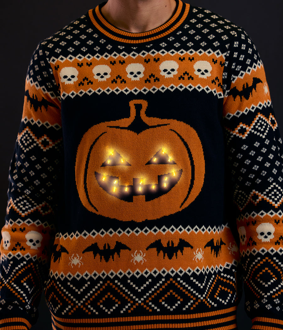 What's a pumpkin without a little light? We didn't do all this carving for no illumination. Jagged teeth and all. we're ready to show it off. Boast your beautiful craftsmanship in the Men's Pumpkin Light Up Sweater. and light up your jack-o-lantern all season long.